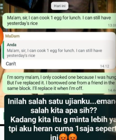 The exchange did not end there. In a follow-up message, the helper apologised repeatedly and said she would replace the egg by borrowing one from a friend in the same building, promising to return it on her next rest day. For many who saw the conversation, that apology was the most troubling part.