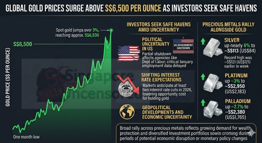 The surge comes after gold briefly pulled back from record levels in the previous session. Earlier in the year, the precious metal had soared to an all-time high of about US$5,594 per ounce, equivalent to around S$7,550.