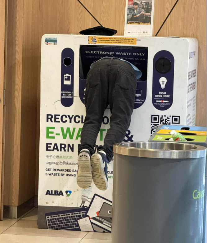 Shoppers at Causeway Point were left puzzled after an unusual sight emerged online — a man spotted with his legs sticking out of an electronic waste recycling bin.