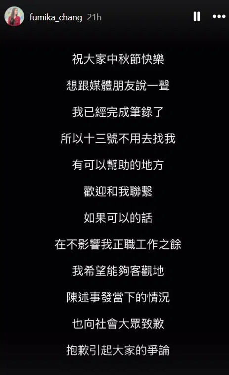 Her post was accompanied by a picture confirming that she had filed an official police report regarding the incident. The apology came after the video of her kicking the elderly woman circulated widely across social media platforms, sparking heated debate among Taiwanese netizens about respect for the elderly and violence on public transport.